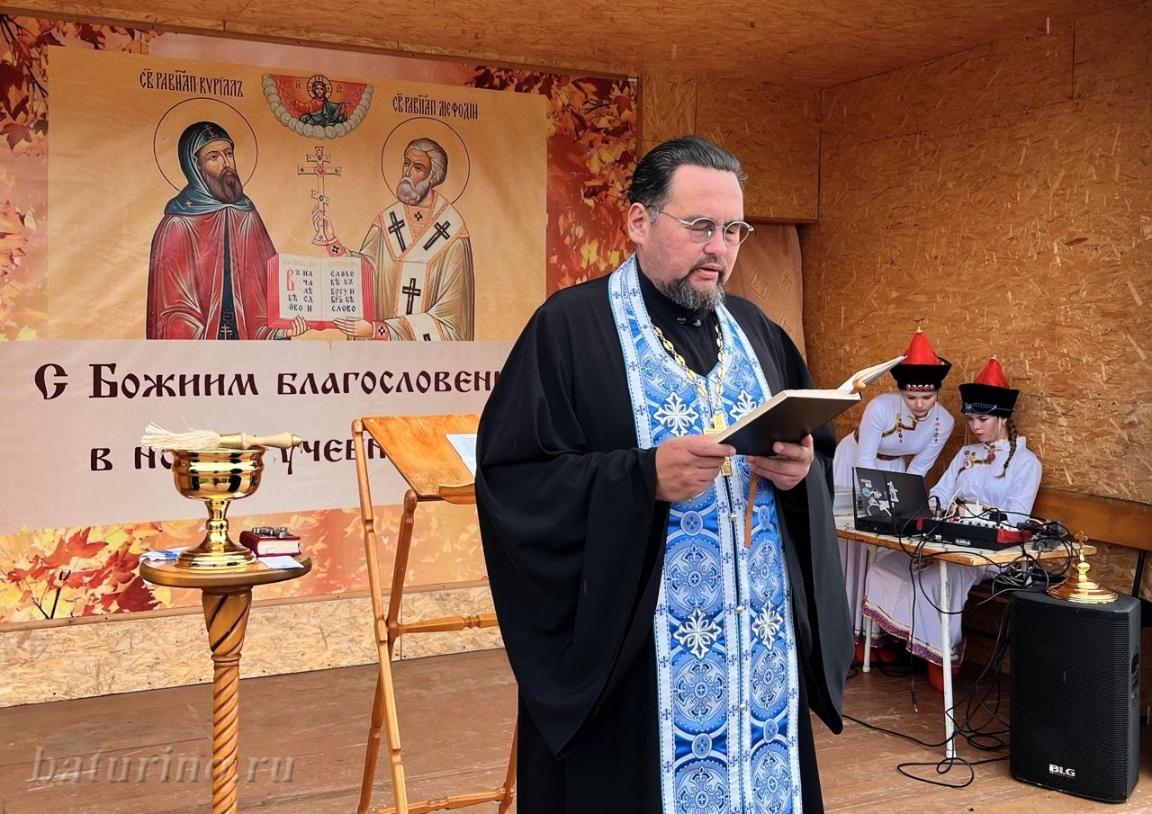 Было совершено молебное пение перед началом учебного года. Отец Михаил прочел молитвы ко Господу, святым равноапостольным Кириллу и Мефодию и преподобному Сергию Радонежскому. После молебна батюшка окропил всех детей святой водой.