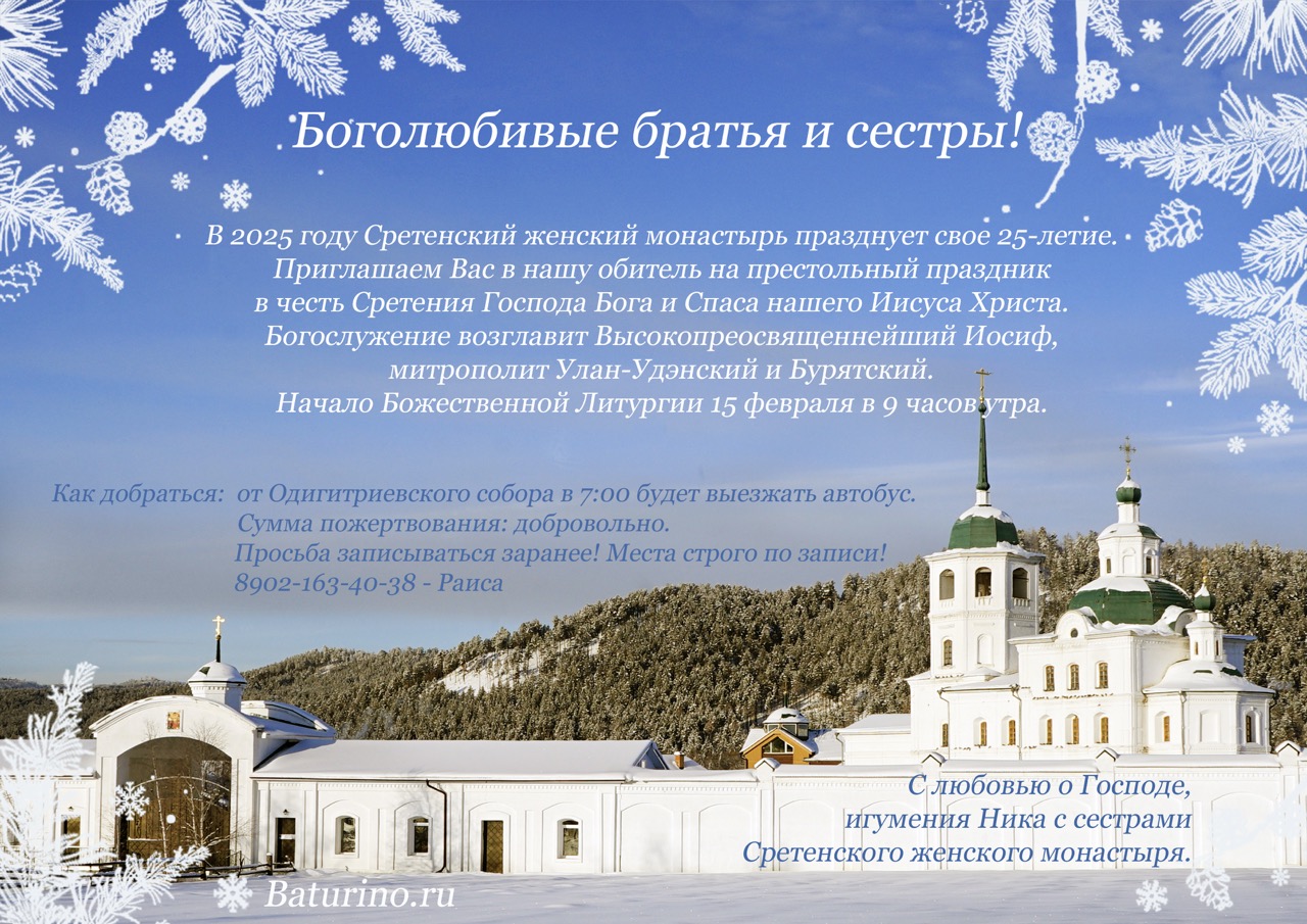 Приглашаем Вас в нашу обитель на престольный праздник в честь Сретения Господа Бога и Спаса нашего Иисуса Христа. Богослужение возглавит Высокопреосвященнейший Иосиф, митрополит Улан-Удэнский и Бурятский.