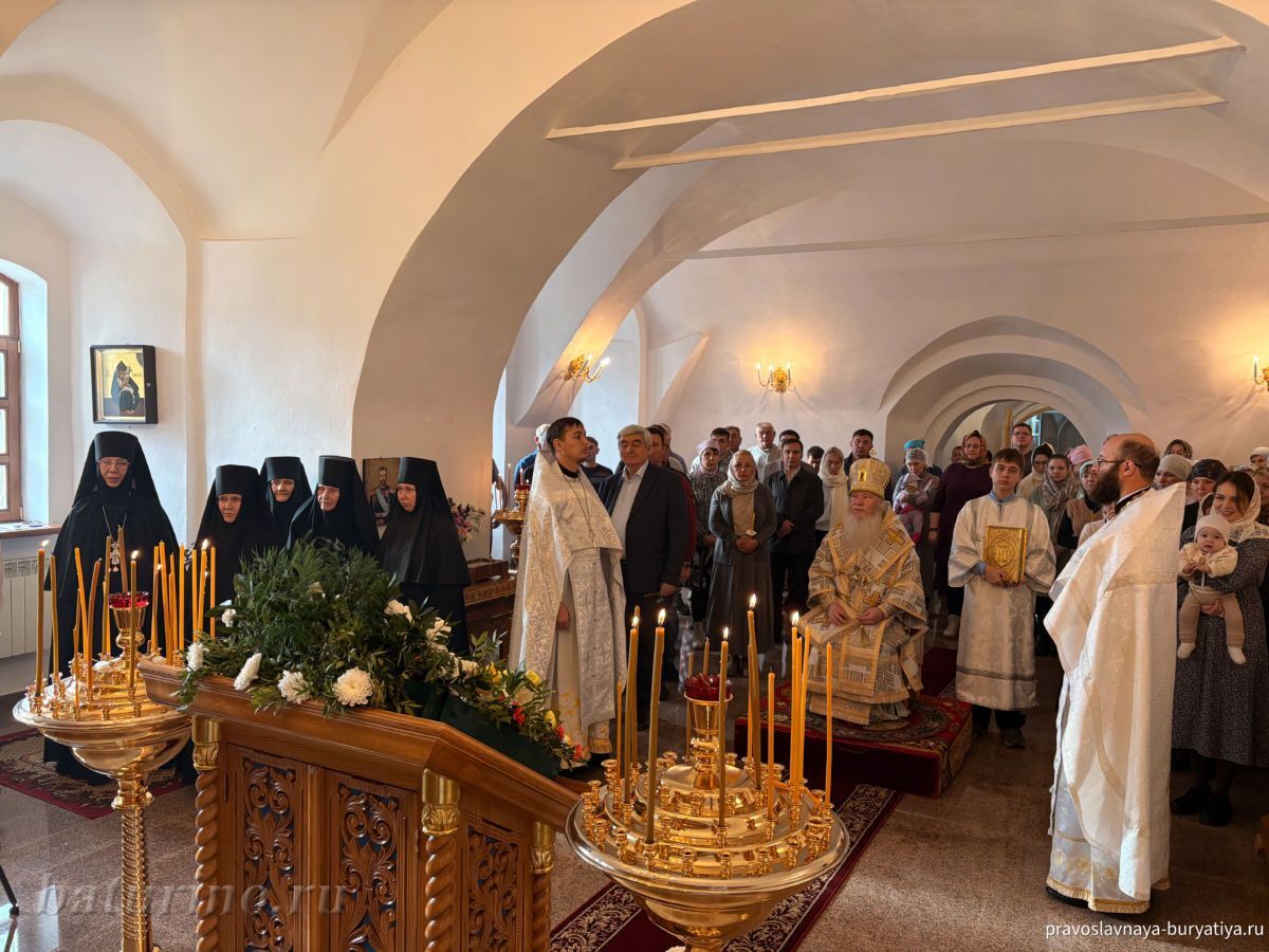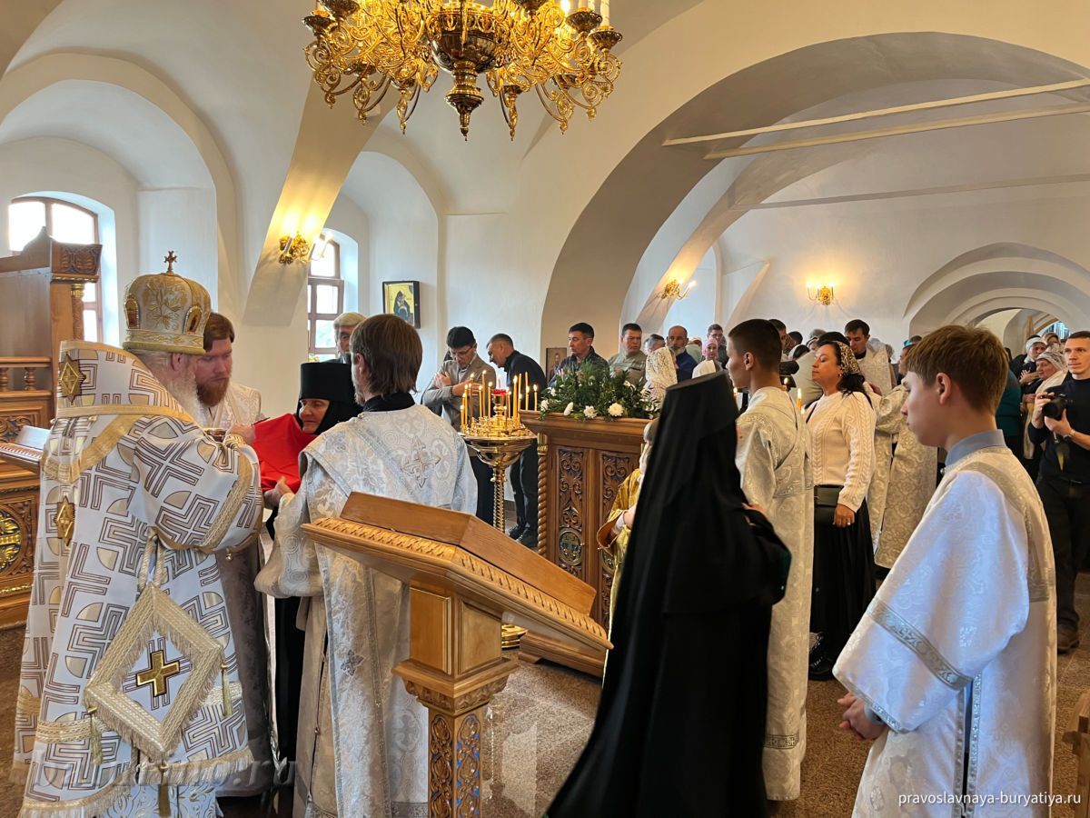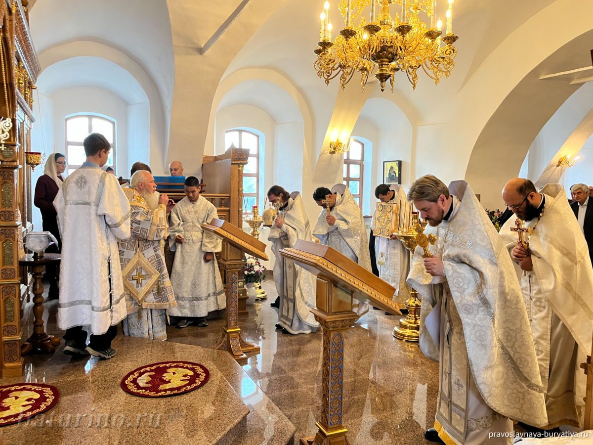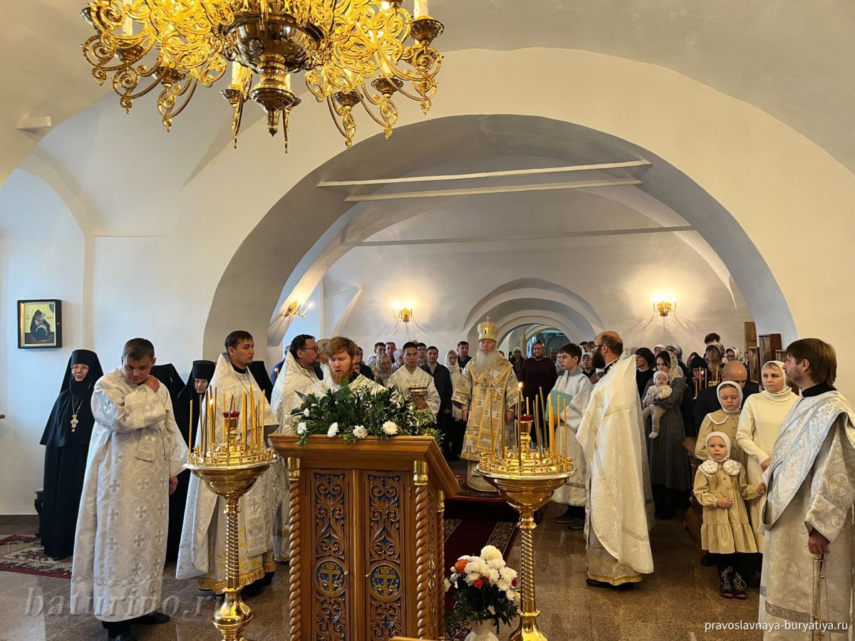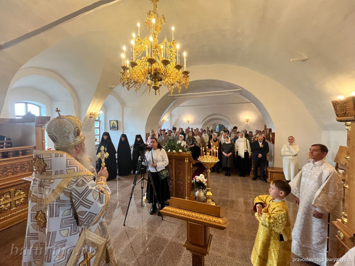 Владыке сослужили секретарь Улан-Удэнской и Бурятской епархии, настоятель Одигитриевского собора г. Улан-Удэ иеромонах Тихон (Тихомиров), благочинный Улан-Удэнского церковного округа, настоятель Вознесенского храма г. Улан-Удэ иерей Роман Хлыбов, клирик монастыря протоиерей Михаил Литвинов, руководитель епархиального молодежного отдела, настоятель Троицкого храма г. Улан-Удэ иерей Николай Власов и настоятель храма в честь Казанской иконы Божией Матери с. Горячинск иерей Николай Аюшеев.